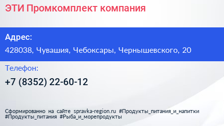 ЭТИ Промкомплект, компания по адресу 428038, Чувашия, Чебоксары, Чернышевского, 20 в дальнейшем Организация, размещена в следующих категориях: