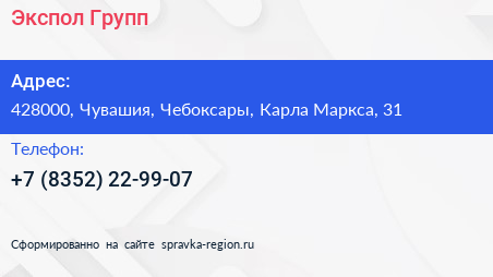 Экспол Групп по адресу 428000, Чувашия, Чебоксары, Карла Маркса, 31 в дальнейшем Организация, размещена в следующих категориях: