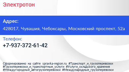 Электротон по адресу 428017, Чувашия, Чебоксары, Московский проспект, 52а в дальнейшем Организация, размещена в следующих категориях: