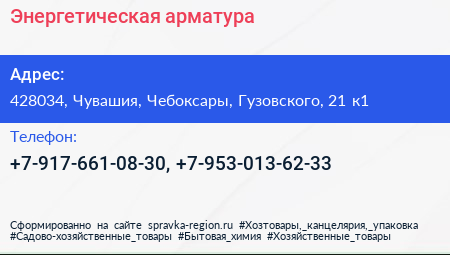 Энергетическая арматура по адресу 428034, Чувашия, Чебоксары, Гузовского, 21 к1 в дальнейшем Организация, размещена в следующих категориях: