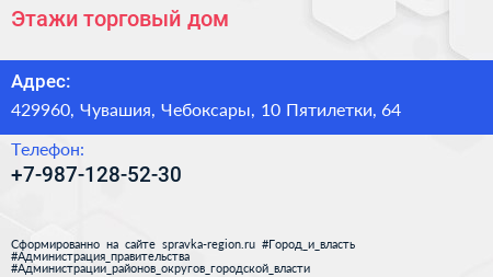 Этажи, торговый дом по адресу 429960, Чувашия, Чебоксары, 10 Пятилетки, 64 в дальнейшем Организация, размещена в следующих категориях: