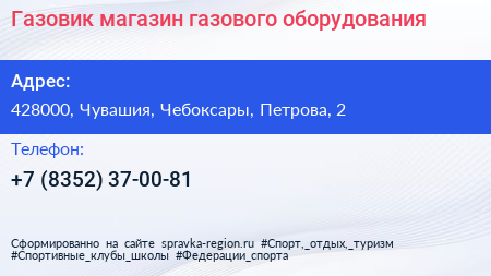 Газовик, магазин газового оборудования по адресу 428000, Чувашия, Чебоксары, Петрова, 2 в дальнейшем Организация, размещена в следующих категориях: