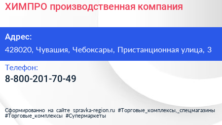 ХИМПРО, производственная компания по адресу 428020, Чувашия, Чебоксары, Пристанционная улица, 3 в дальнейшем Организация, размещена в следующих категориях: