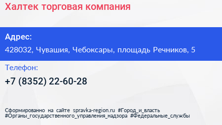 Халтек, торговая компания по адресу 428032, Чувашия, Чебоксары, площадь Речников, 5 в дальнейшем Организация, размещена в следующих категориях: