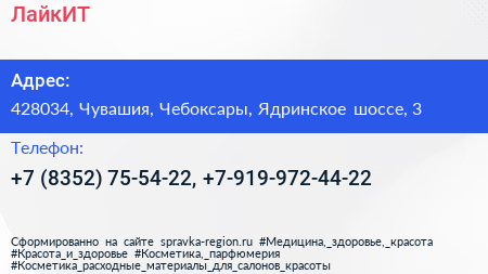 ЛайкИТ по адресу 428034, Чувашия, Чебоксары, Ядринское шоссе, 3 в дальнейшем Организация, размещена в следующих категориях: