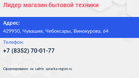 Лидер, магазин бытовой техники по адресу 429950, Чувашия, Чебоксары, Винокурова, 64 в дальнейшем Организация, размещена в следующих категориях: