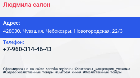 Людмила, салон по адресу 428030, Чувашия, Чебоксары, Новогородская, 22/3 в дальнейшем Организация, размещена в следующих категориях: