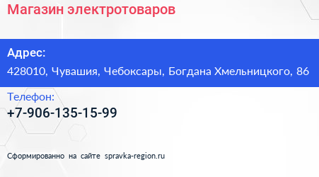 Магазин электротоваров по адресу 428010, Чувашия, Чебоксары, Богдана Хмельницкого, 86 в дальнейшем Организация, размещена в следующих категориях: