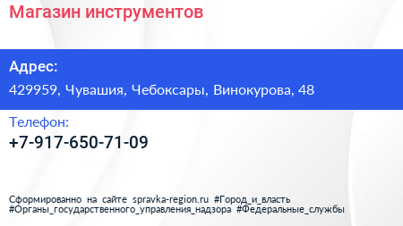 Магазин инструментов по адресу 429959, Чувашия, Чебоксары, Винокурова, 48 в дальнейшем Организация, размещена в следующих категориях: