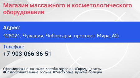 Магазин массажного и косметологического оборудования по адресу 428024, Чувашия, Чебоксары, проспект Мира, 62г в дальнейшем Организация, размещена в следующих категориях: