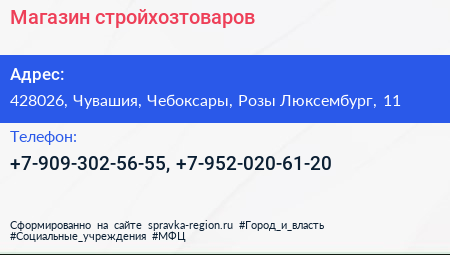 Магазин стройхозтоваров по адресу 428026, Чувашия, Чебоксары, Розы Люксембург, 11 в дальнейшем Организация, размещена в следующих категориях: