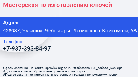 Мастерская по изготовлению ключей по адресу 428037, Чувашия, Чебоксары, Ленинского Комсомола, 58а в дальнейшем Организация, размещена в следующих категориях: