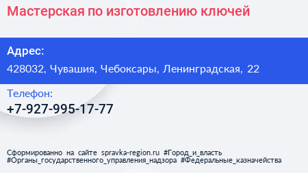 Мастерская по изготовлению ключей по адресу 428032, Чувашия, Чебоксары, Ленинградская, 22 в дальнейшем Организация, размещена в следующих категориях:
