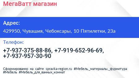 МегаВатт, магазин по адресу 429950, Чувашия, Чебоксары, 10 Пятилетки, 23а в дальнейшем Организация, размещена в следующих категориях: