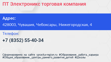 ПТ-Электроникс, торговая компания по адресу 428003, Чувашия, Чебоксары, Нижегородская, 4 в дальнейшем Организация, размещена в следующих категориях: