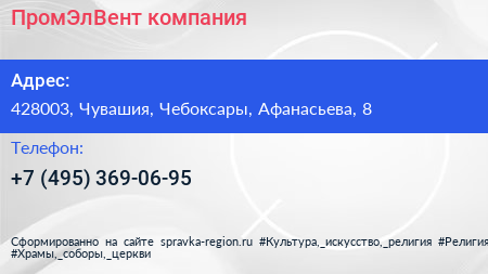 ПромЭлВент, компания по адресу 428003, Чувашия, Чебоксары, Афанасьева, 8 в дальнейшем Организация, размещена в следующих категориях: