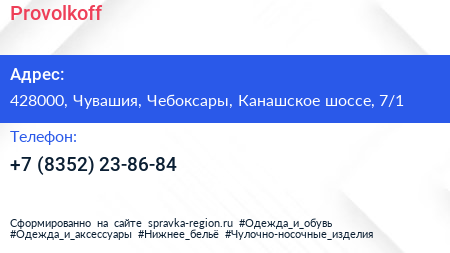 Provolkoff по адресу 428000, Чувашия, Чебоксары, Канашское шоссе, 7/1 в дальнейшем Организация, размещена в следующих категориях: