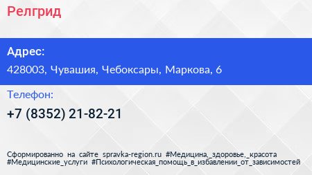 Релгрид по адресу 428003, Чувашия, Чебоксары, Маркова, 6 в дальнейшем Организация, размещена в следующих категориях: