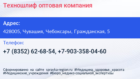 Техношлиф, оптовая компания по адресу 428005, Чувашия, Чебоксары, Гражданская, 5 в дальнейшем Организация, размещена в следующих категориях: