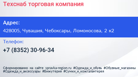 Техснаб, торговая компания по адресу 428005, Чувашия, Чебоксары, Ломоносова, 2 к2 в дальнейшем Организация, размещена в следующих категориях: