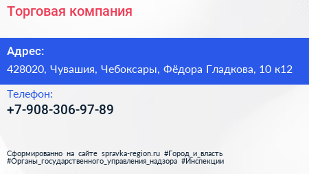 Торговая компания по адресу 428020, Чувашия, Чебоксары, Фёдора Гладкова, 10 к12 в дальнейшем Организация, размещена в следующих категориях: