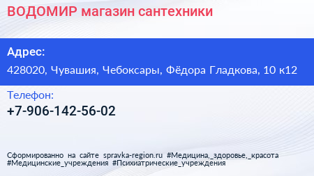 ВОДОМИР, магазин сантехники по адресу 428020, Чувашия, Чебоксары, Фёдора Гладкова, 10 к12 в дальнейшем Организация, размещена в следующих категориях:
