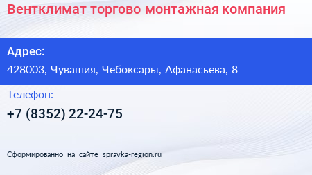 Вентклимат, торгово-монтажная компания по адресу 428003, Чувашия, Чебоксары, Афанасьева, 8 в дальнейшем Организация, размещена в следующих категориях: