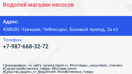 Водолей, магазин насосов по адресу 428020, Чувашия, Чебоксары, Базовый проезд, 3а к1 в дальнейшем Организация, размещена в следующих категориях: