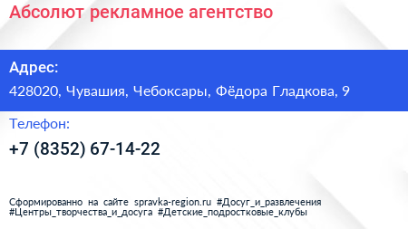 Абсолют, рекламное агентство по адресу 428020, Чувашия, Чебоксары, Фёдора Гладкова, 9 в дальнейшем Организация, размещена в следующих категориях: