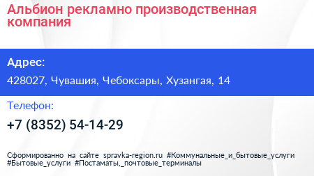 Альбион, рекламно-производственная компания по адресу 428027, Чувашия, Чебоксары, Хузангая, 14 в дальнейшем Организация, размещена в следующих категориях: