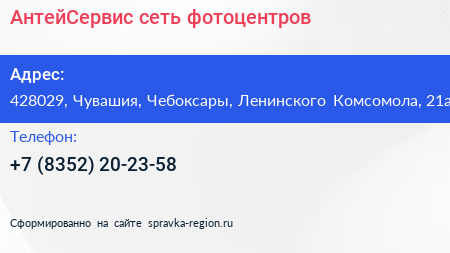 АнтейСервис, сеть фотоцентров по адресу 428029, Чувашия, Чебоксары, Ленинского Комсомола, 21а в дальнейшем Организация, размещена в следующих категориях: