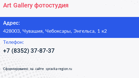 Art Gallery, фотостудия по адресу 428003, Чувашия, Чебоксары, Энгельса, 1 к2 в дальнейшем Организация, размещена в следующих категориях: