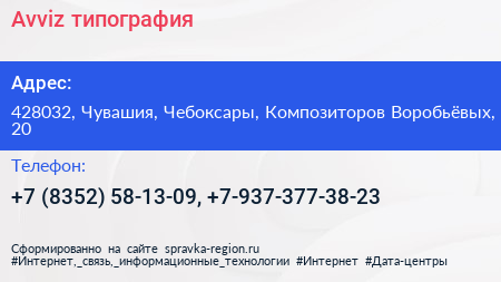 Avviz, типография по адресу 428032, Чувашия, Чебоксары, Композиторов Воробьёвых, 20 в дальнейшем Организация, размещена в следующих категориях: