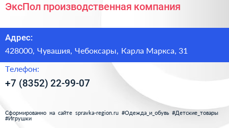 ЭксПол, производственная компания по адресу 428000, Чувашия, Чебоксары, Карла Маркса, 31 в дальнейшем Организация, размещена в следующих категориях: