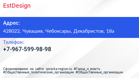 EstDesign по адресу 428022, Чувашия, Чебоксары, Декабристов, 18а в дальнейшем Организация, размещена в следующих категориях: