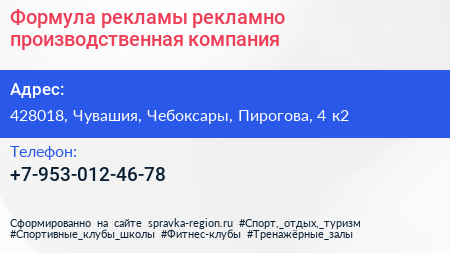 Формула рекламы, рекламно-производственная компания по адресу 428018, Чувашия, Чебоксары, Пирогова, 4 к2 в дальнейшем Организация, размещена в следующих категориях: