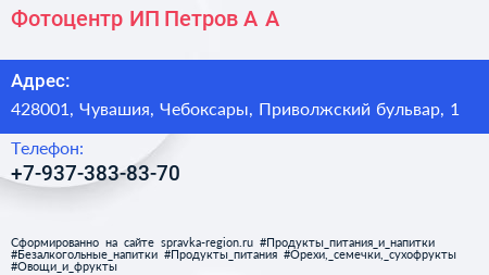 Фотоцентр, ИП Петров А.А. по адресу 428001, Чувашия, Чебоксары, Приволжский бульвар, 1 в дальнейшем Организация, размещена в следующих категориях:
