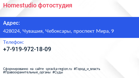 Homestudio, фотостудия по адресу 428024, Чувашия, Чебоксары, проспект Мира, 9 в дальнейшем Организация, размещена в следующих категориях: