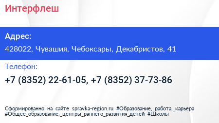 Интерфлеш по адресу 428022, Чувашия, Чебоксары, Декабристов, 41 в дальнейшем Организация, размещена в следующих категориях: