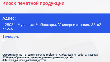Киоск печатной продукции по адресу 428034, Чувашия, Чебоксары, Университетская, 38 к2 киоск в дальнейшем Организация, размещена в следующих категориях: