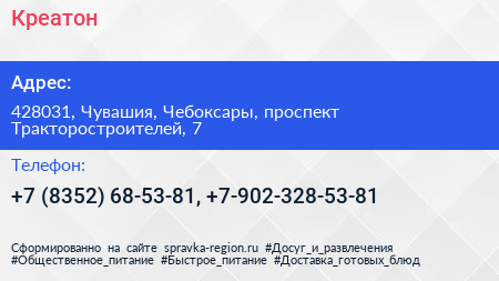 Креатон по адресу 428031, Чувашия, Чебоксары, проспект Тракторостроителей, 7 в дальнейшем Организация, размещена в следующих категориях: