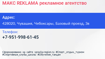 МАКС REKLAMA, рекламное агентство по адресу 428020, Чувашия, Чебоксары, Базовый проезд, 3в в дальнейшем Организация, размещена в следующих категориях: