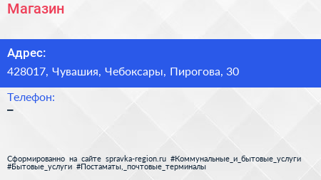 Магазин по адресу 428017, Чувашия, Чебоксары, Пирогова, 30 в дальнейшем Организация, размещена в следующих категориях: