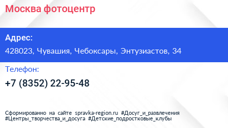 Москва, фотоцентр по адресу 428023, Чувашия, Чебоксары, Энтузиастов, 34 в дальнейшем Организация, размещена в следующих категориях: