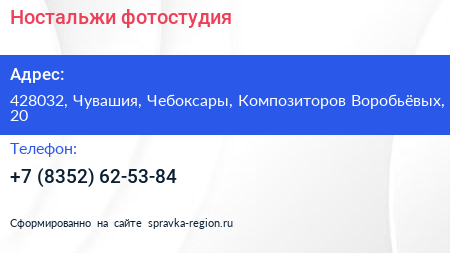 Ностальжи, фотостудия по адресу 428032, Чувашия, Чебоксары, Композиторов Воробьёвых, 20 в дальнейшем Организация, размещена в следующих категориях: