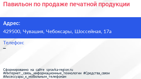 Павильон по продаже печатной продукции по адресу 429500, Чувашия, Чебоксары, Шоссейная, 17а в дальнейшем Организация, размещена в следующих категориях: