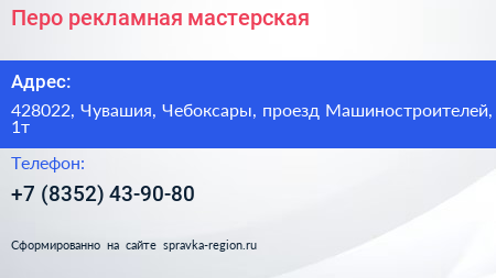 Перо, рекламная мастерская по адресу 428022, Чувашия, Чебоксары, проезд Машиностроителей, 1т в дальнейшем Организация, размещена в следующих категориях:
