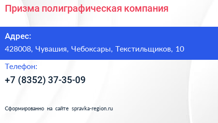 Призма, полиграфическая компания по адресу 428008, Чувашия, Чебоксары, Текстильщиков, 10 в дальнейшем Организация, размещена в следующих категориях: