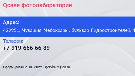 Qcase, фотолаборатория по адресу 429951, Чувашия, Чебоксары, бульвар Гидростроителей, 4 в дальнейшем Организация, размещена в следующих категориях: