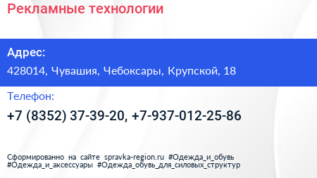 Рекламные технологии по адресу 428014, Чувашия, Чебоксары, Крупской, 18 в дальнейшем Организация, размещена в следующих категориях: